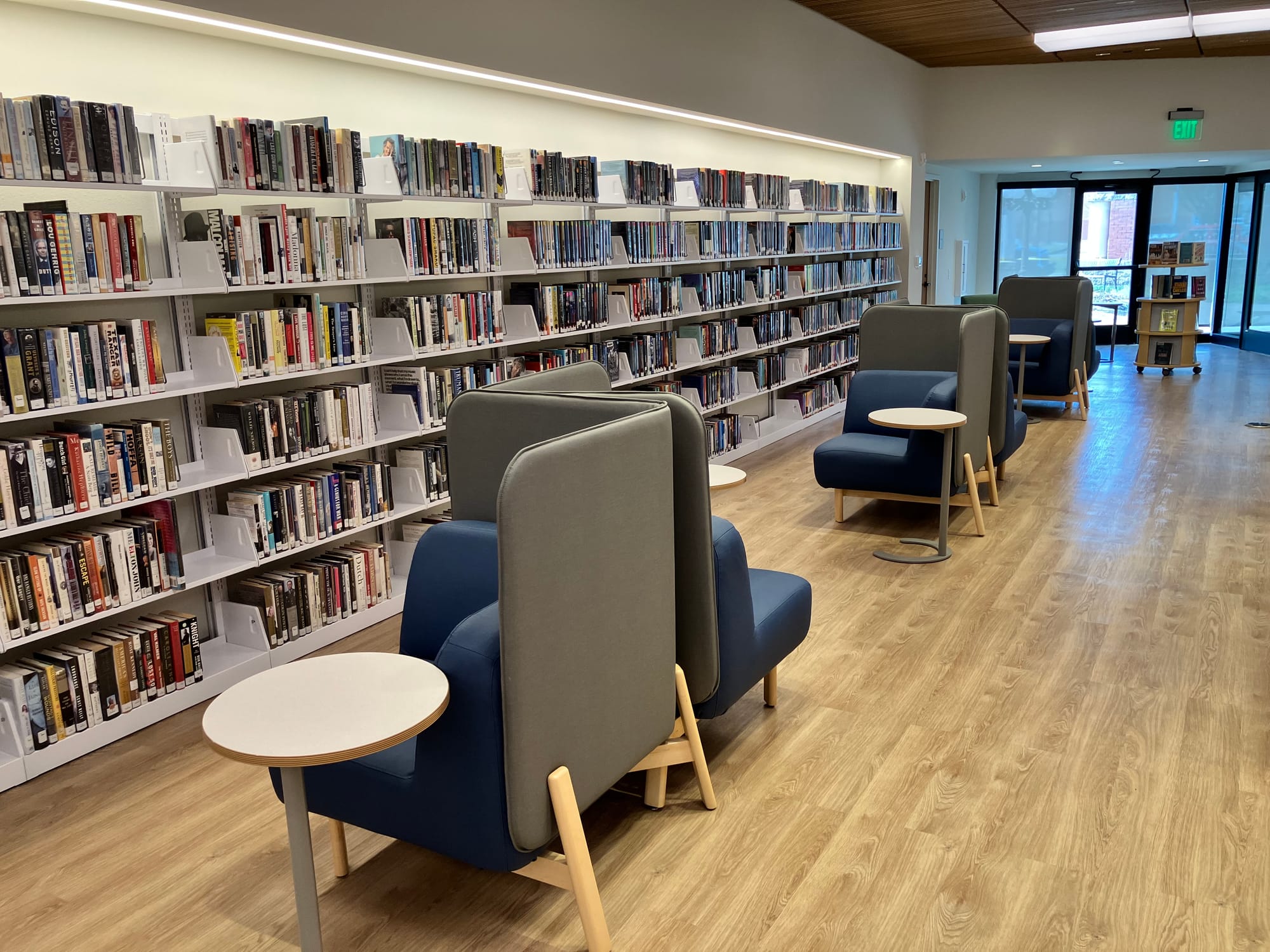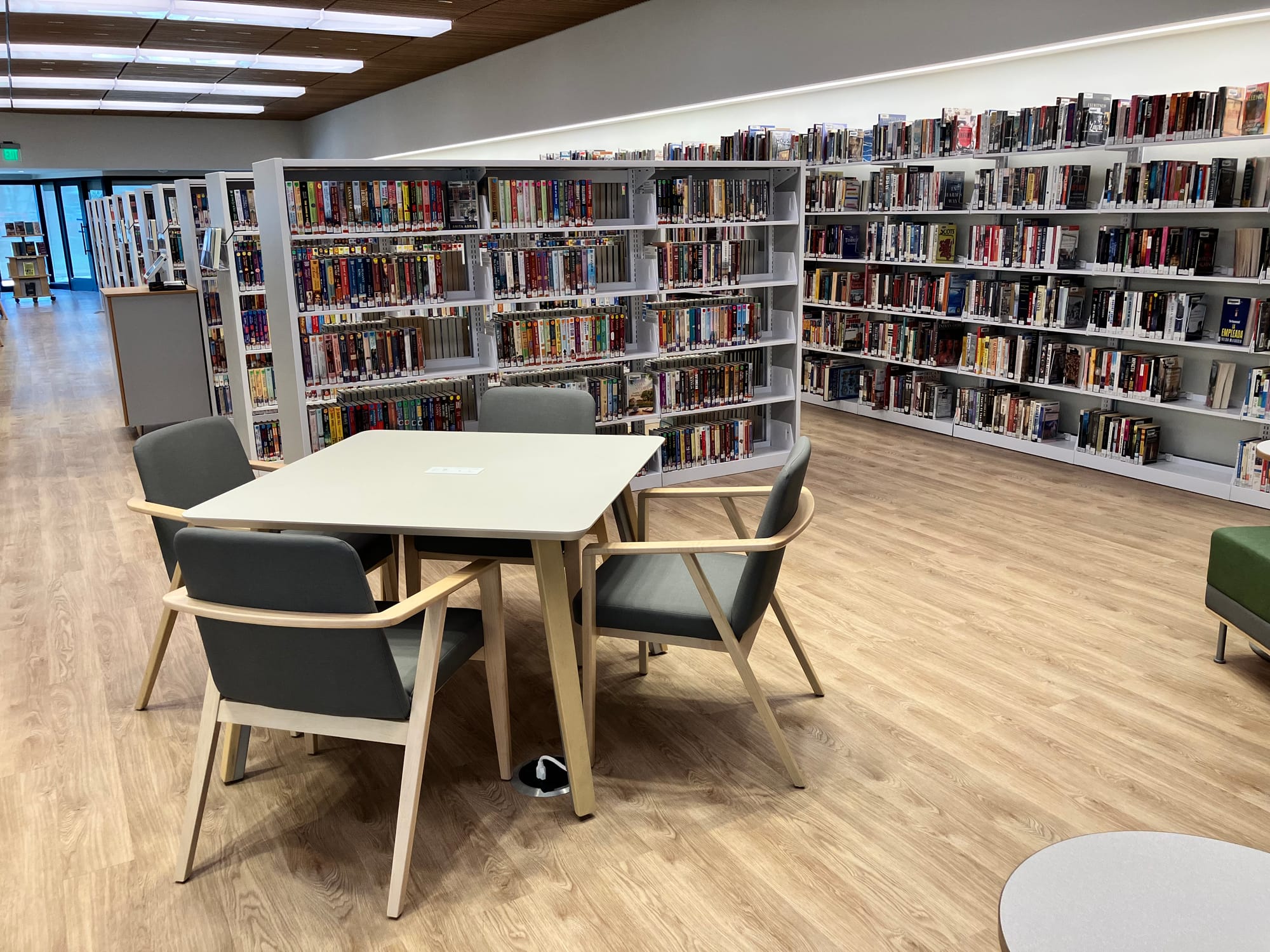The new shelving is lower so people can see over it, which Diaz believes contributes to a “more open feeling” while also eliminating the need for people to get up on step stools to reach the higher shelves. New furniture is located throughout the library, which also features multiple electronic device-charging stations for patrons’ use.