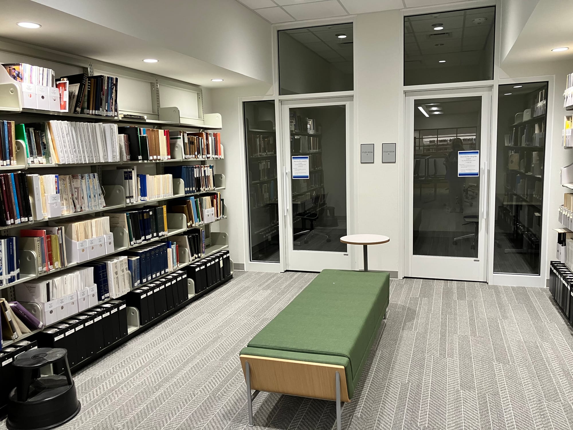 Above, left, the new breakout room on the library's west side; above, right, the two new study rooms in the reference area.