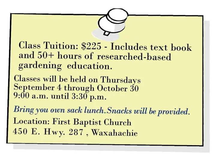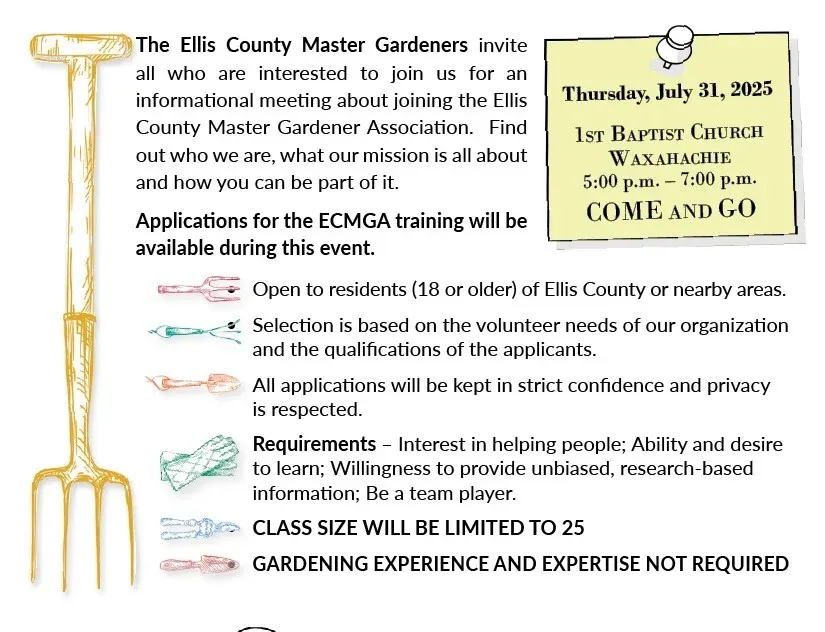 The Ellis County Master Gardeners have announced their next training class and invite interested community members to attend a come-and-go information session from 5-7 p.m. Thursday, July 31, at First Baptist Church in Waxahachie.