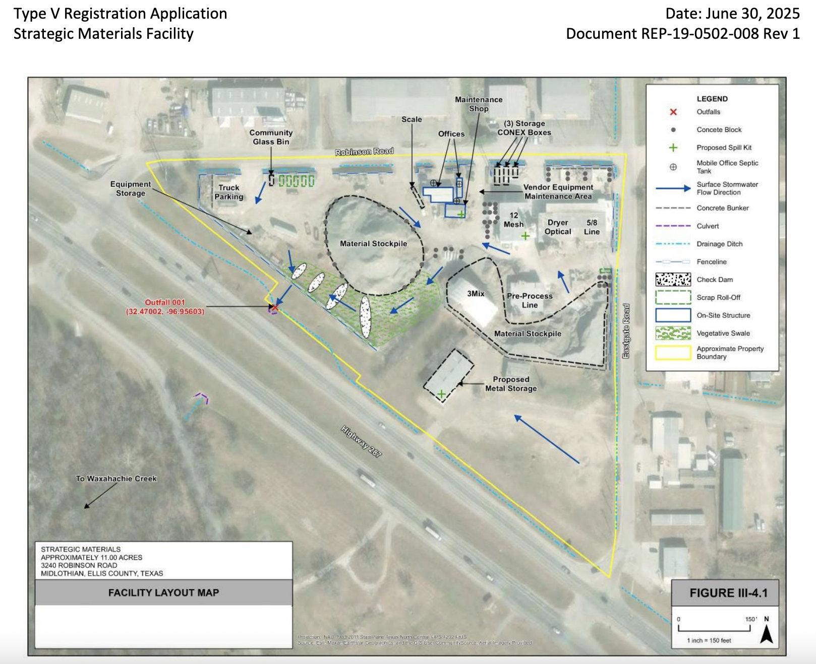 Per the application, the 11-acre facility is “designed to receive a maximum of 550 tons per day of waste,” with a maximum of 6,876 tons of generated waste “at any point in time” and a “total maximum quantity of material on-site [of] 20,000 tons.” SMI estimates a processing time of one to four days for the materials it receives and up to a 72-hour timeframe for the removal of any wastes generated by that processing.
