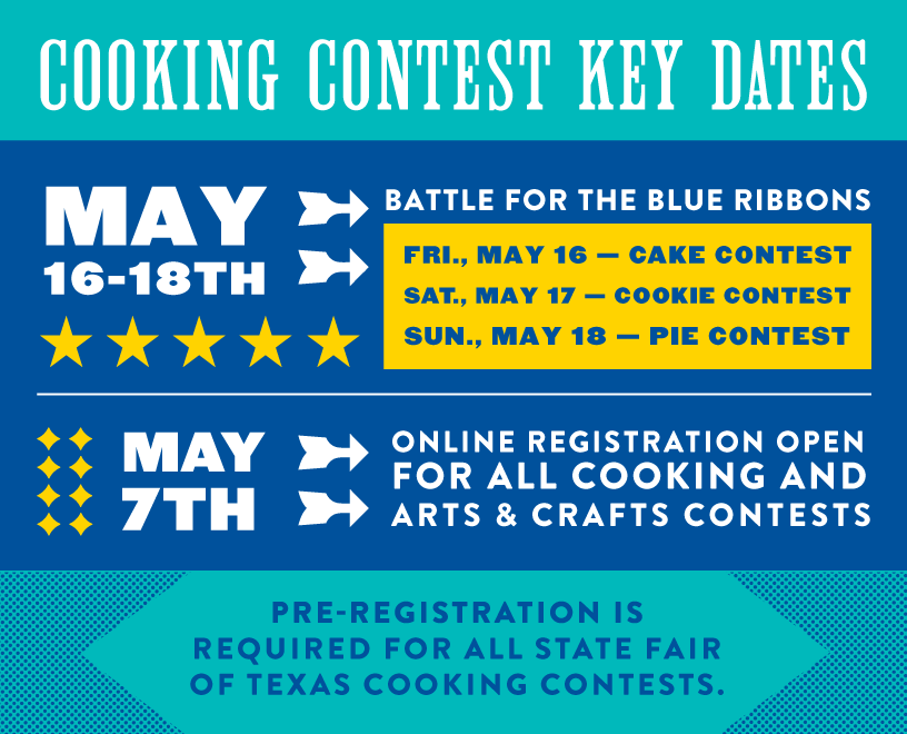 The State Fair of Texas will host its Battle for the Blue Ribbons from May 16-18. Register now for the only spring cooking competition featuring three of the fair’s most popular Creative Arts Cooking Contests: cookies, cakes, and pies.