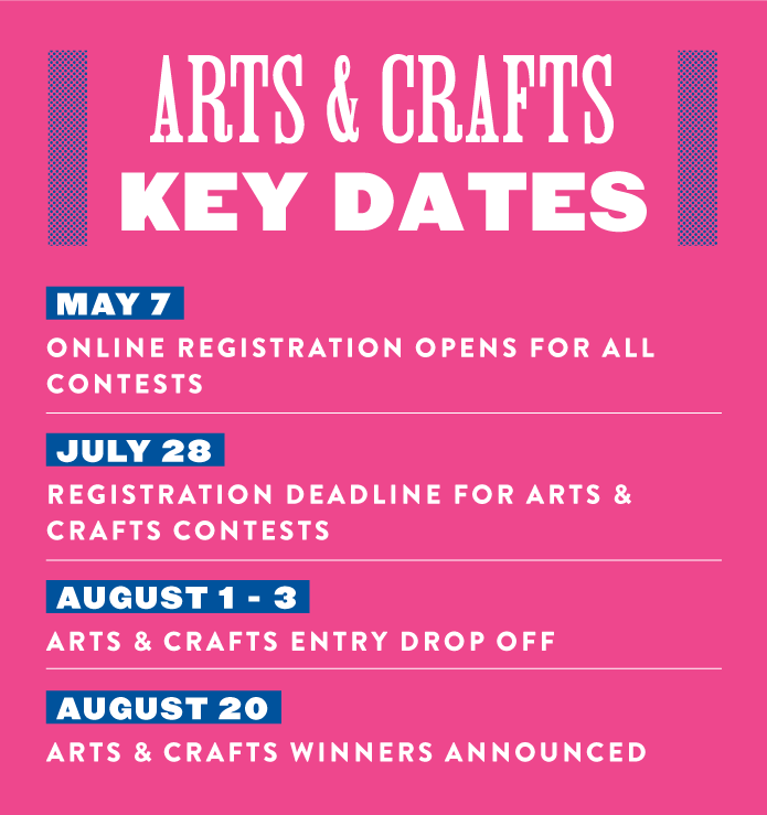 The deadline to submit online entry forms and fees for the arts and crafts contests is Monday, July 28.