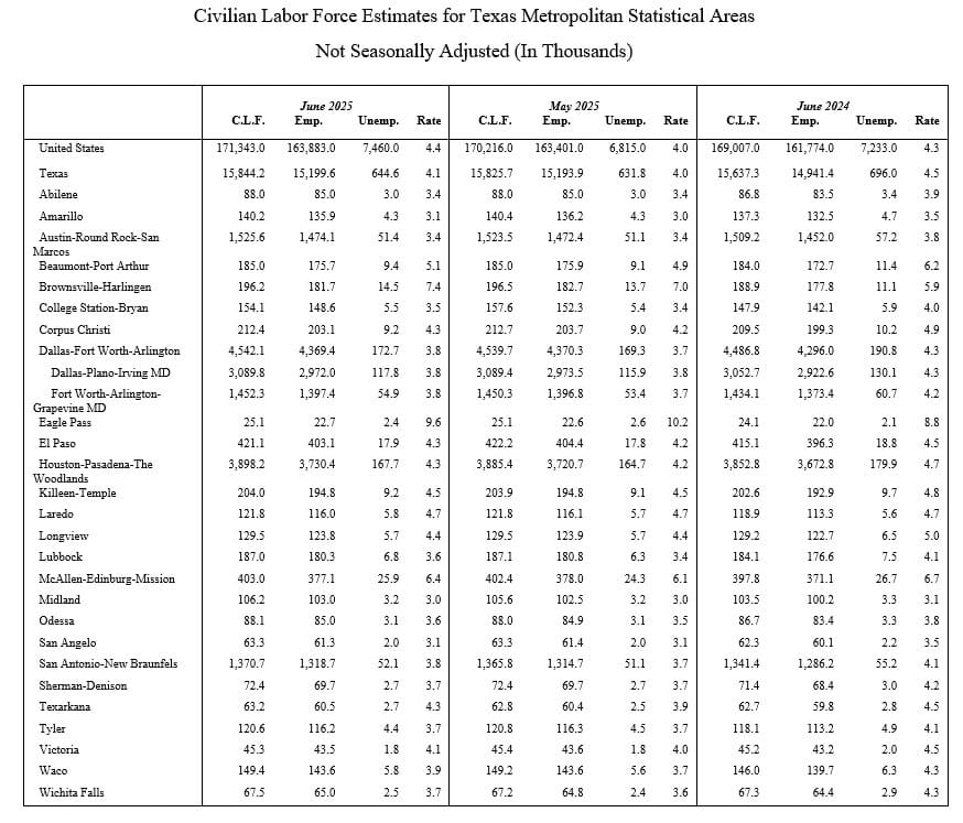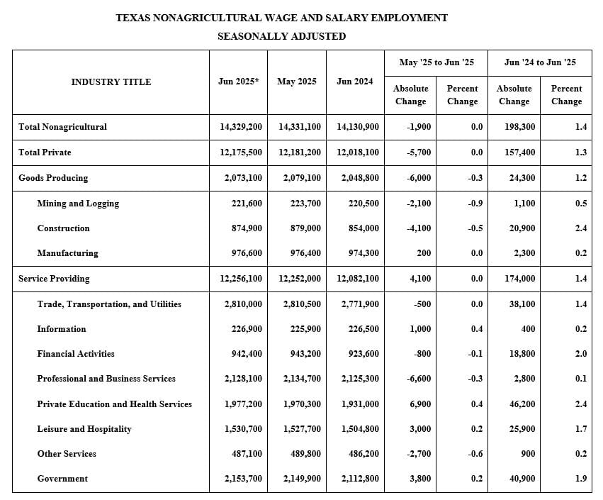 Texas added 198,300 jobs over the year for an annual nonfarm growth rate of 1.4 percent, outpacing the national growth rate by 0.3 percentage points. The state had 14,329,200 total nonfarm jobs after decreasing by 1,900 positions over the month of June.