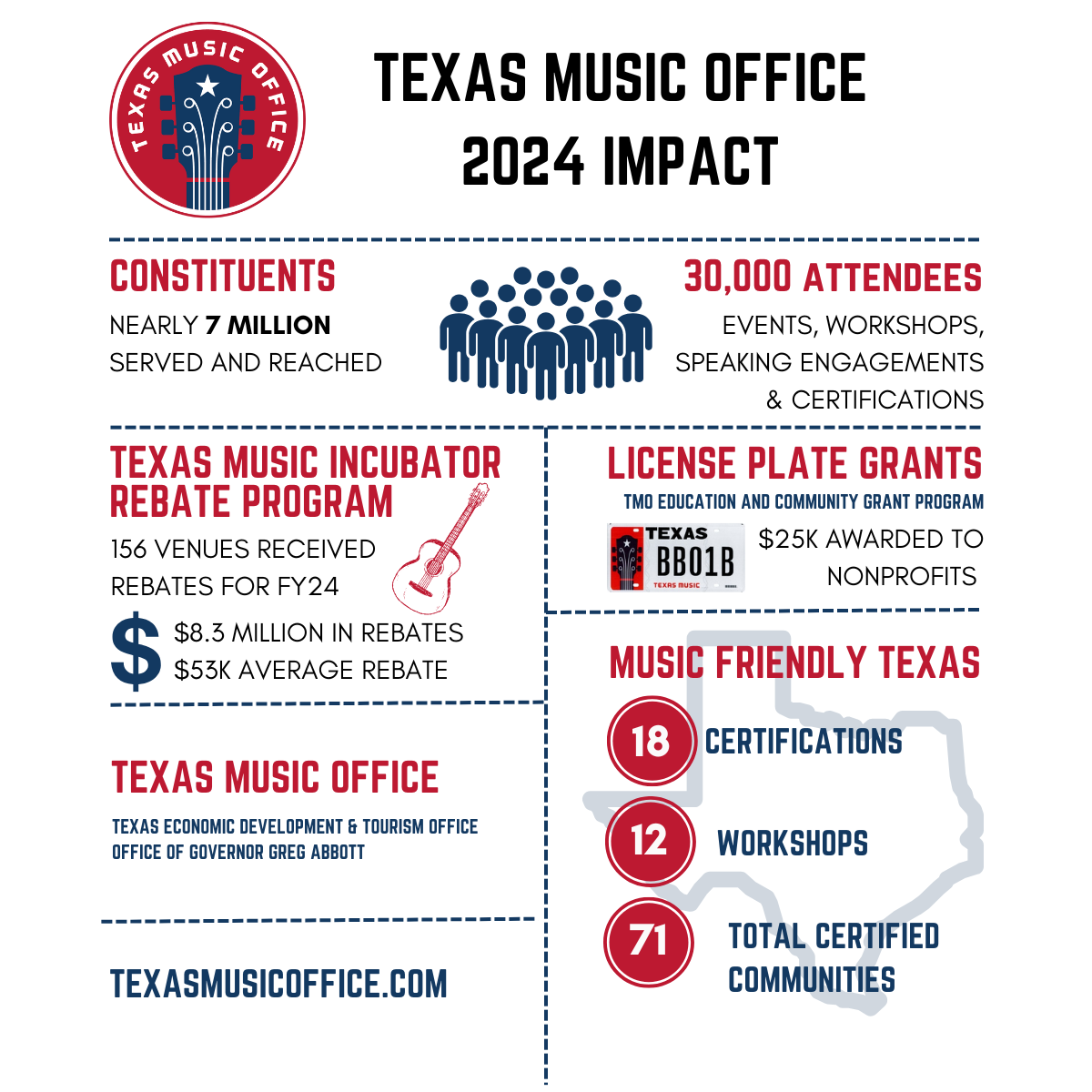 The Texas Music Office is part of the Governor’s Office of Economic Development and Tourism and is the nation’s first and longest-running state music office. Since 1990, TMO has served to promote the growth of Texas music businesses, musicians, and communities.