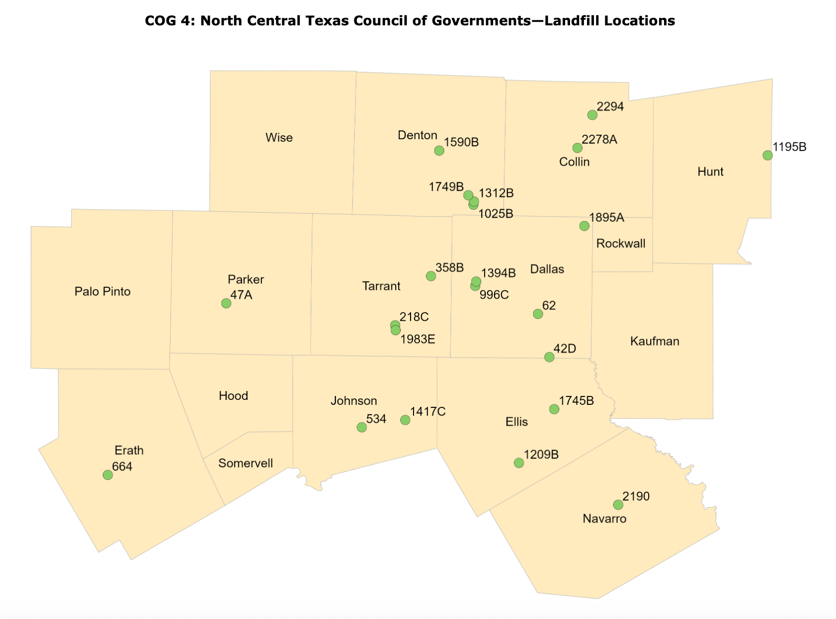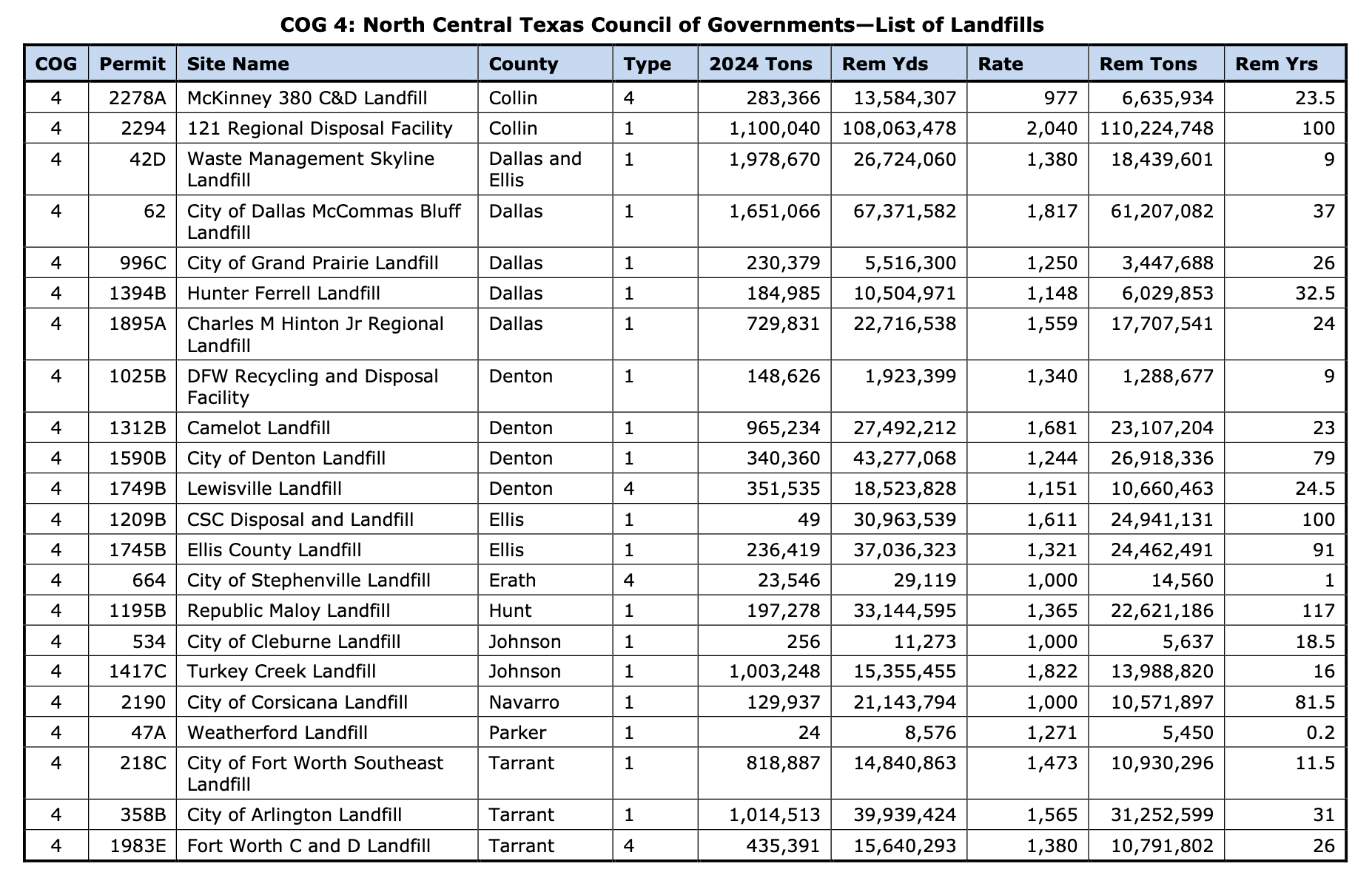 The NCTCOG, which serves more than 8.5 million people, has a reserve capacity of about 37 years across its membership. Ellis County itself has two active type 1 landfills.